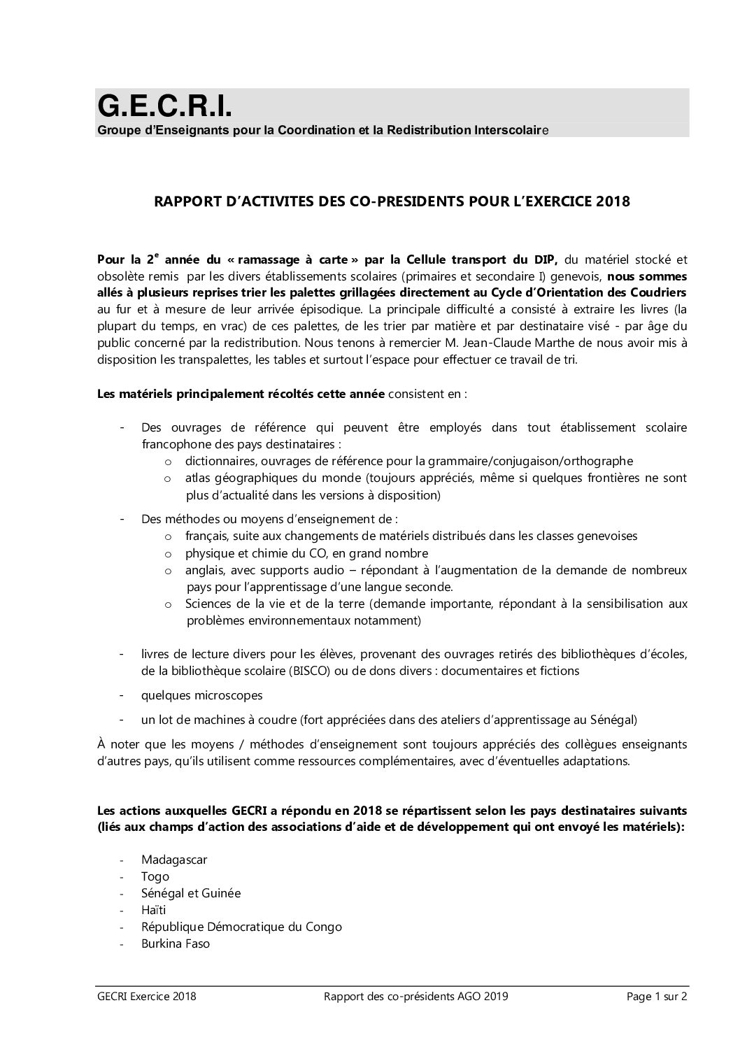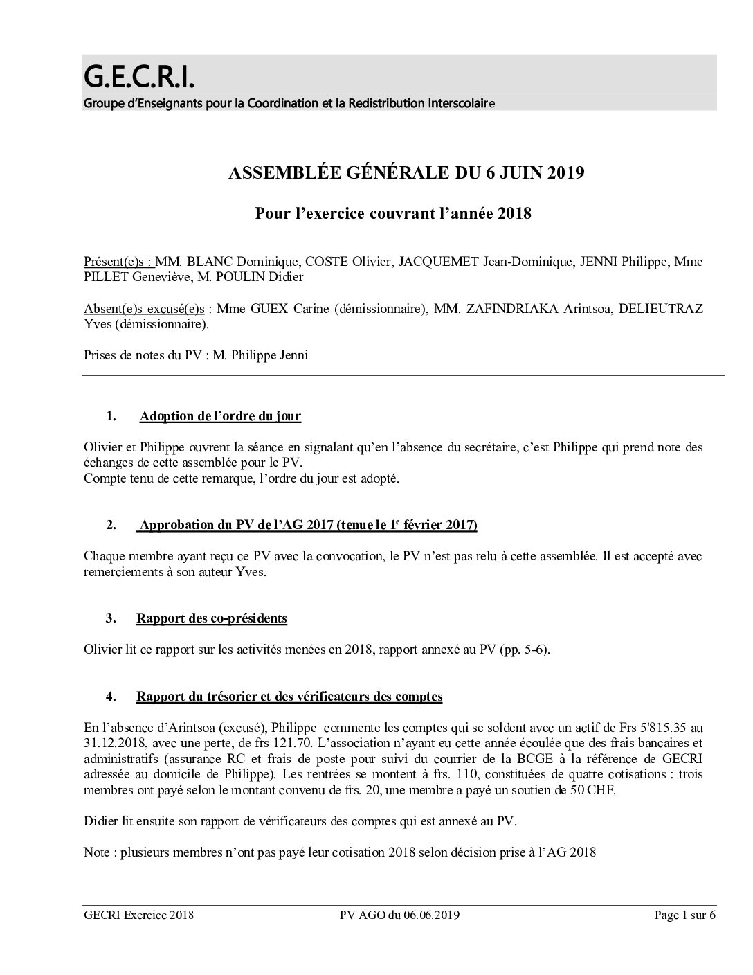 Le document présente le résultat de l’exercice de l’année 2018, comprenant notamment le bilan comptable et l’élection des membres du comité de l’association.