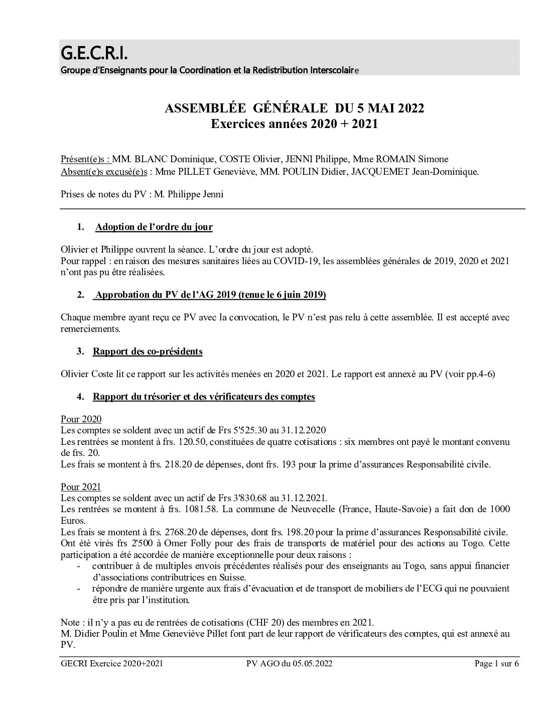 Les assemblées générales de 2021 et 2020 n’ont pas eu lieu