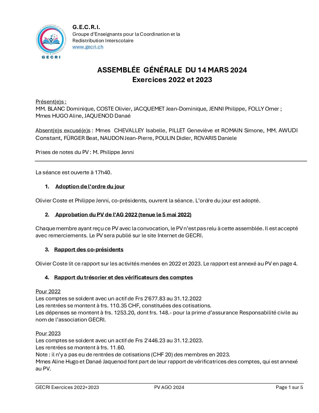 Le document présente le résultat de l’exercice des années 2022 et 2023. Il contient notamment le rapport d’activités, le bilan comptable et l’élection des membres du comité de l’association.
